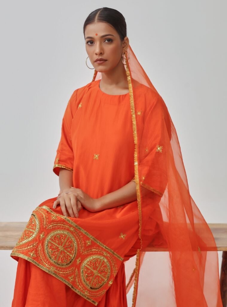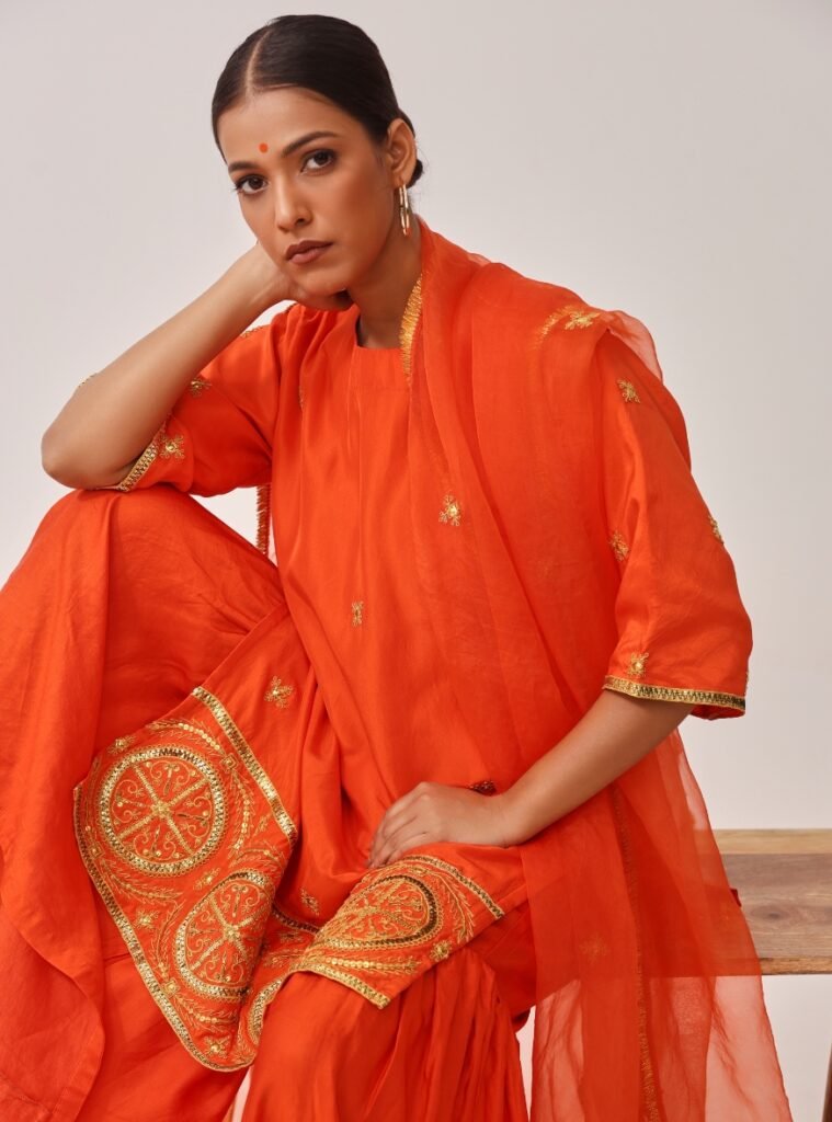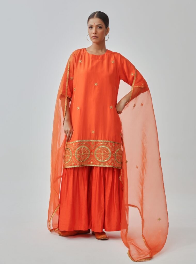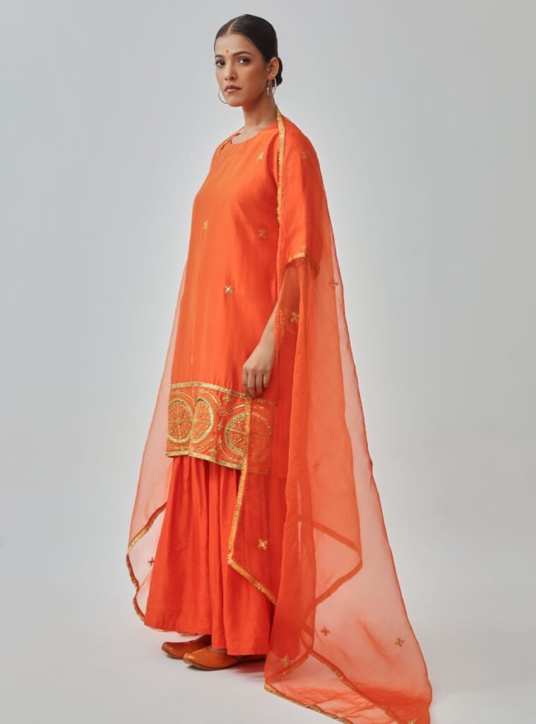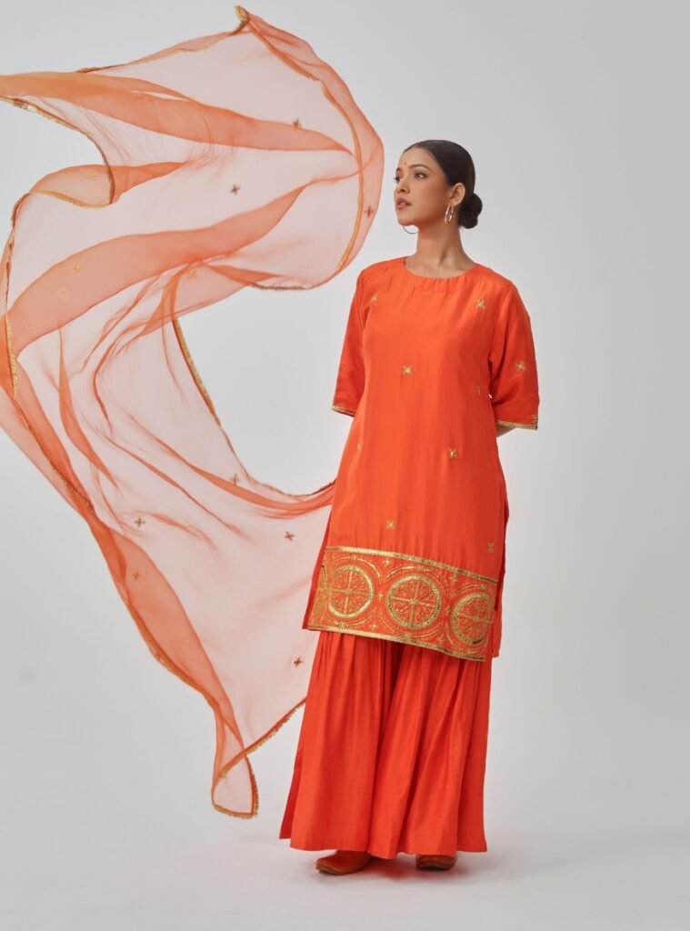 The silk kurta is accentuated with golden hand embroidery, especially along the hemline, adding richness to its vibrant hue. It is paired with a flared linen-silk gharara, offering comfort and movement.