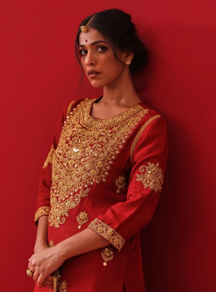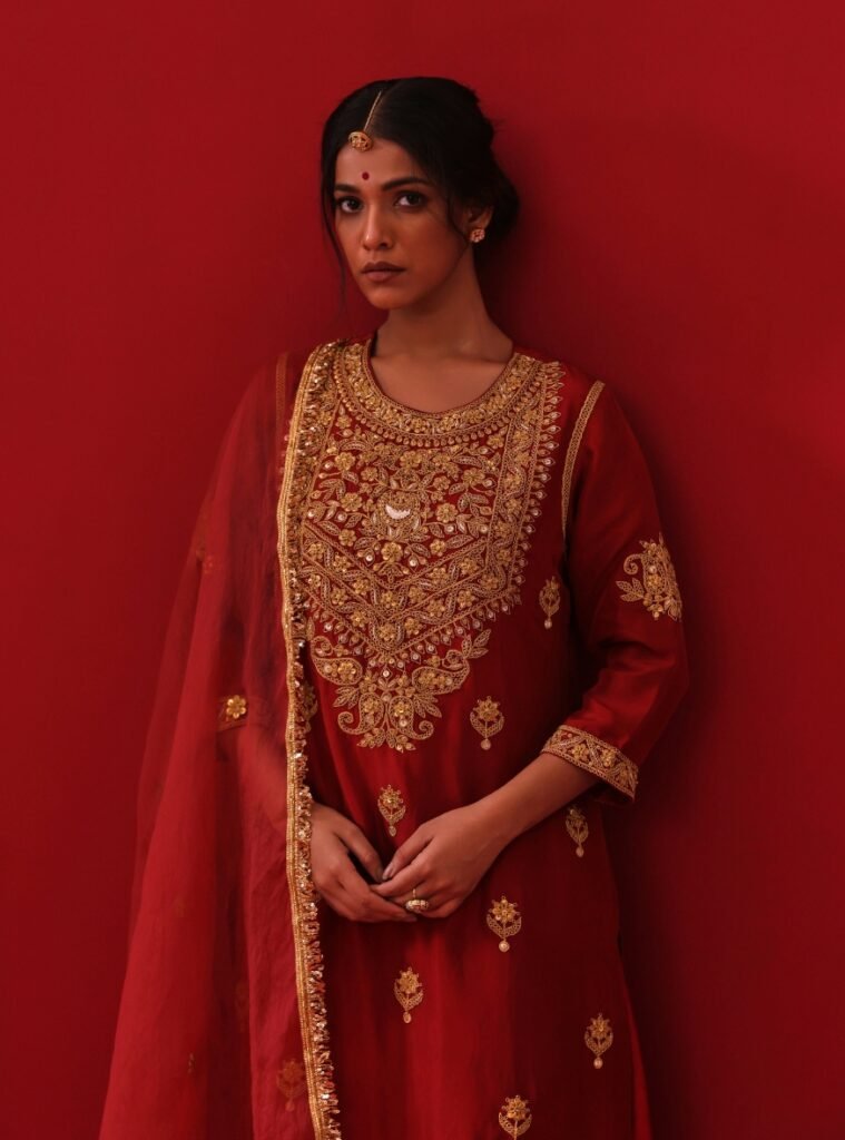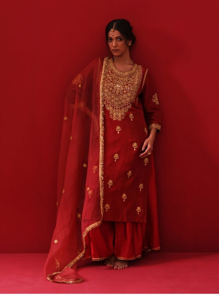 This exquisite ensemble features a rich Silk Kurta highlighted with detailed craftsmanship, paired with a flowy Linen-Silk Gharara that adds effortless elegance.