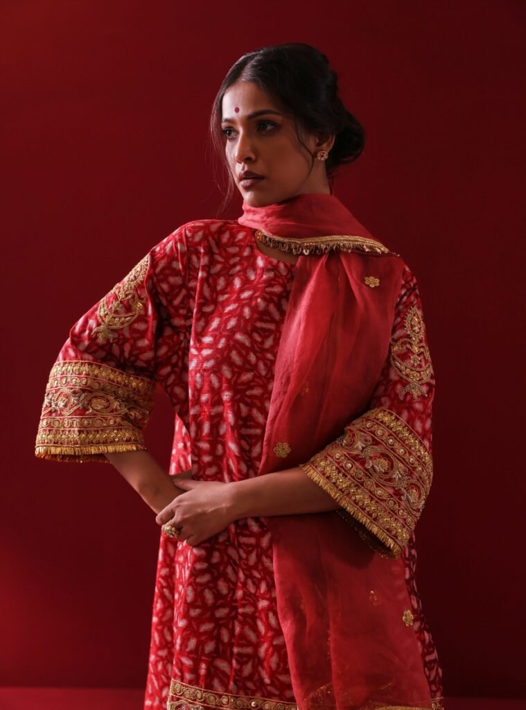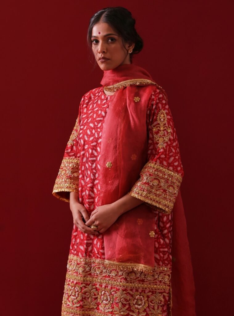 The look is completed with a lightweight Organza Dupatta, embellished with subtle accents, making it a perfect blend of richness and sophistication for festive and celebratory occasions.