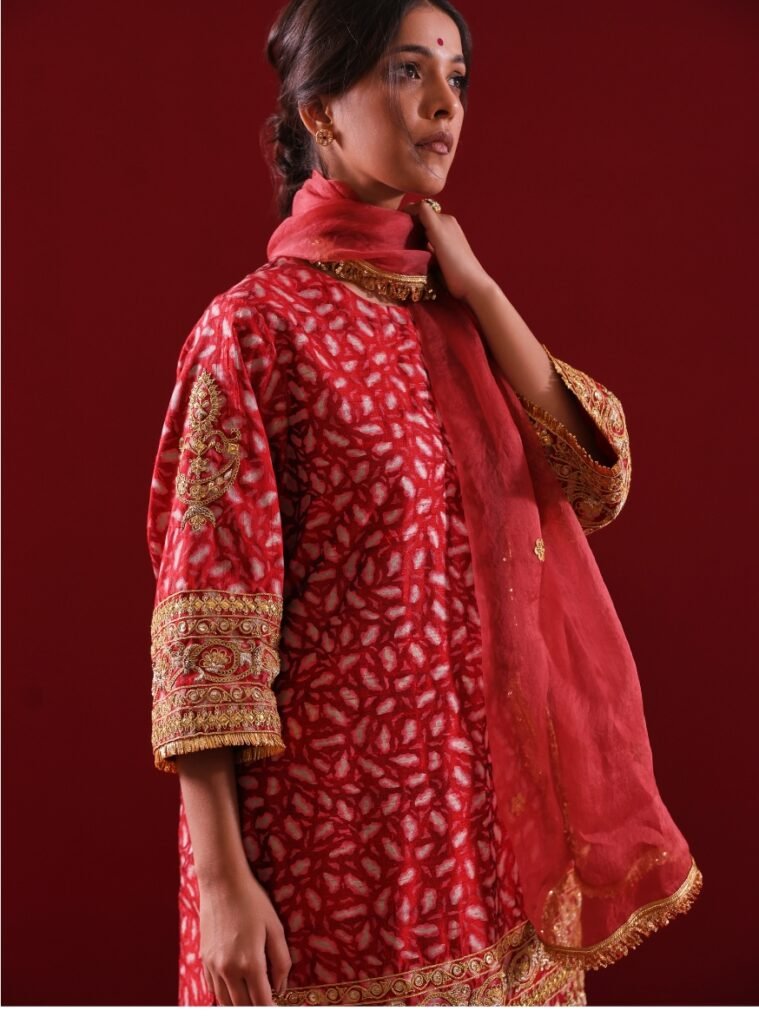 This stunning traditional set features a Raw Silk Kurta adorned with intricate golden embroidery and detailed motifs, paired with a flowing Linen-Silk Gharara that adds grace and elegance.