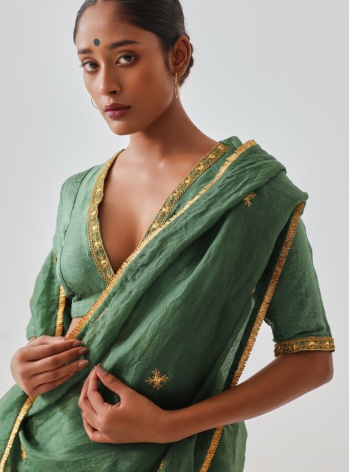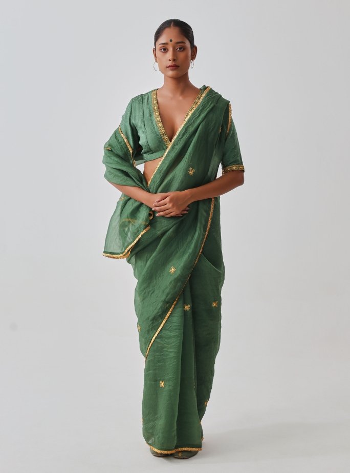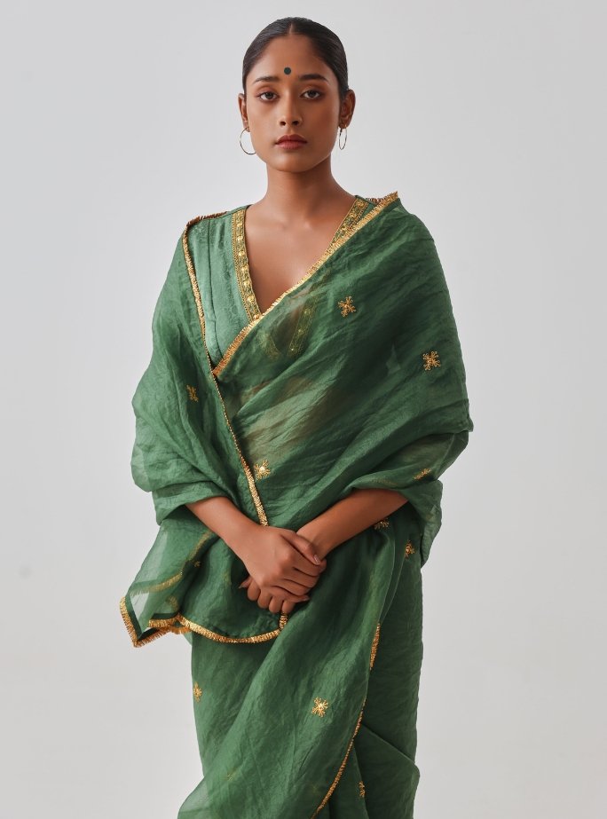 A green organza saree that is simple yet classy, enhanced with detailed handcrafted golden embroidery and a delicate golden border. Lightweight and graceful, the organza fabric drapes