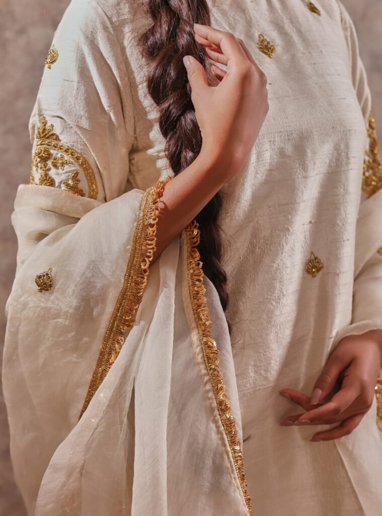 The raw silk kurta, adorned with delicate golden embroidery, offers a refined charm, while the linen silk pants ensure comfort with sophistication.