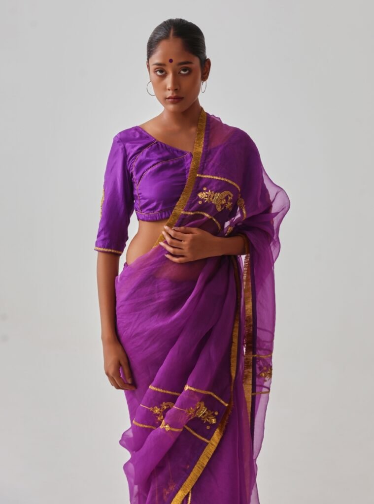 An elegant purple organza saree designed with refined golden embroidery and a sleek golden border. The sheer texture of organza paired with the richness of embroidery creates a look that is both contemporary and traditional. Lightweight and graceful, this saree is perfect for evening weddings, festive gatherings, and cultural occasions where you want to stand out with subtle sophistication.