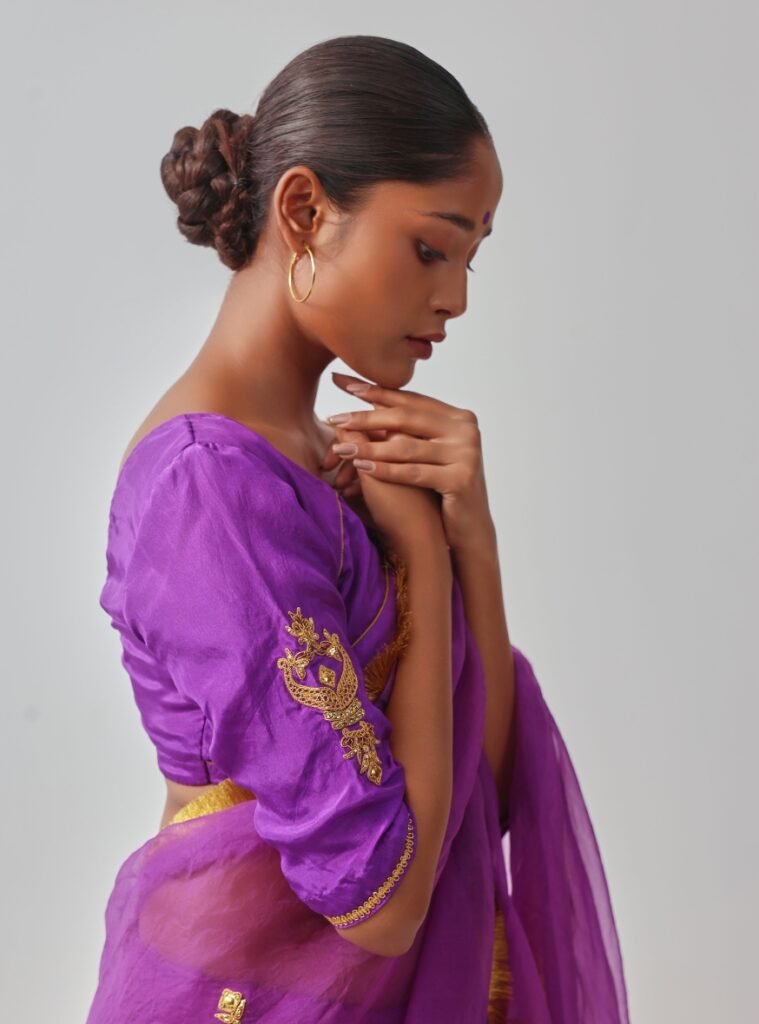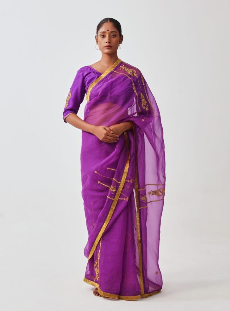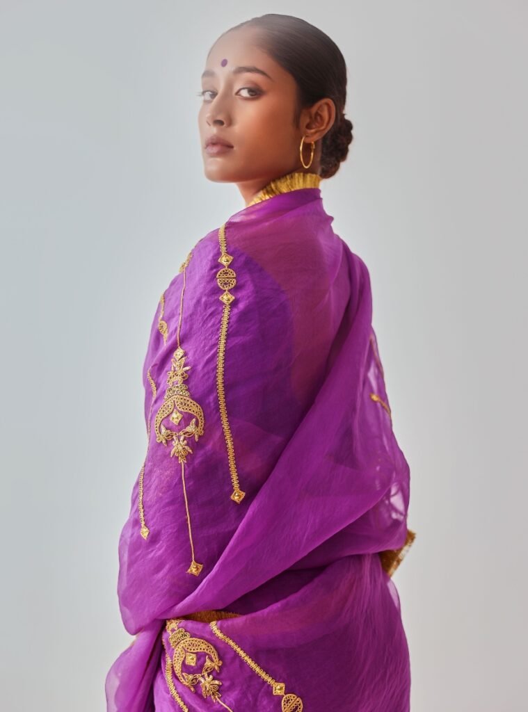 An elegant purple organza saree designed with refined golden embroidery and a sleek golden border.