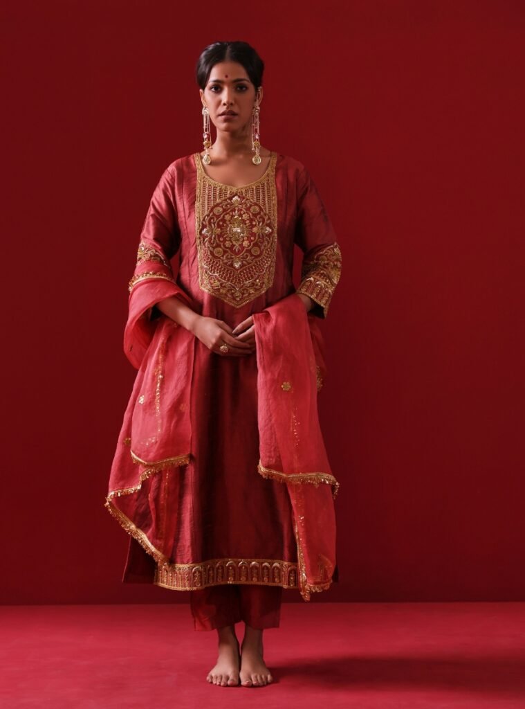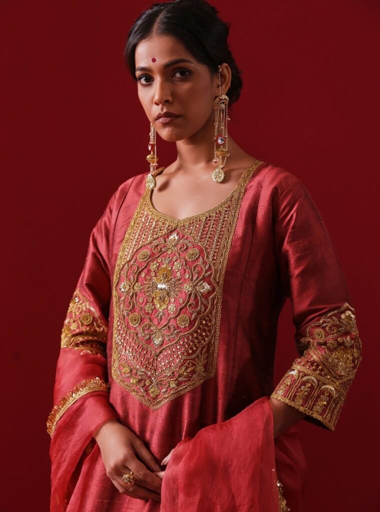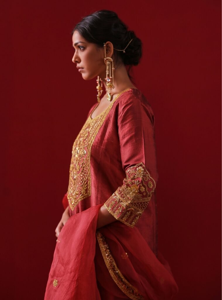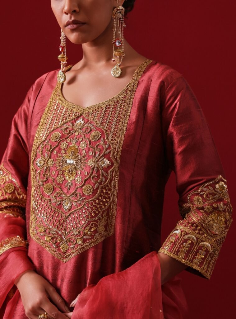 The kurta features intricate hand-embroidered golden zari and threadwork on the yoke and sleeves, adding timeless elegance to its rich texture.