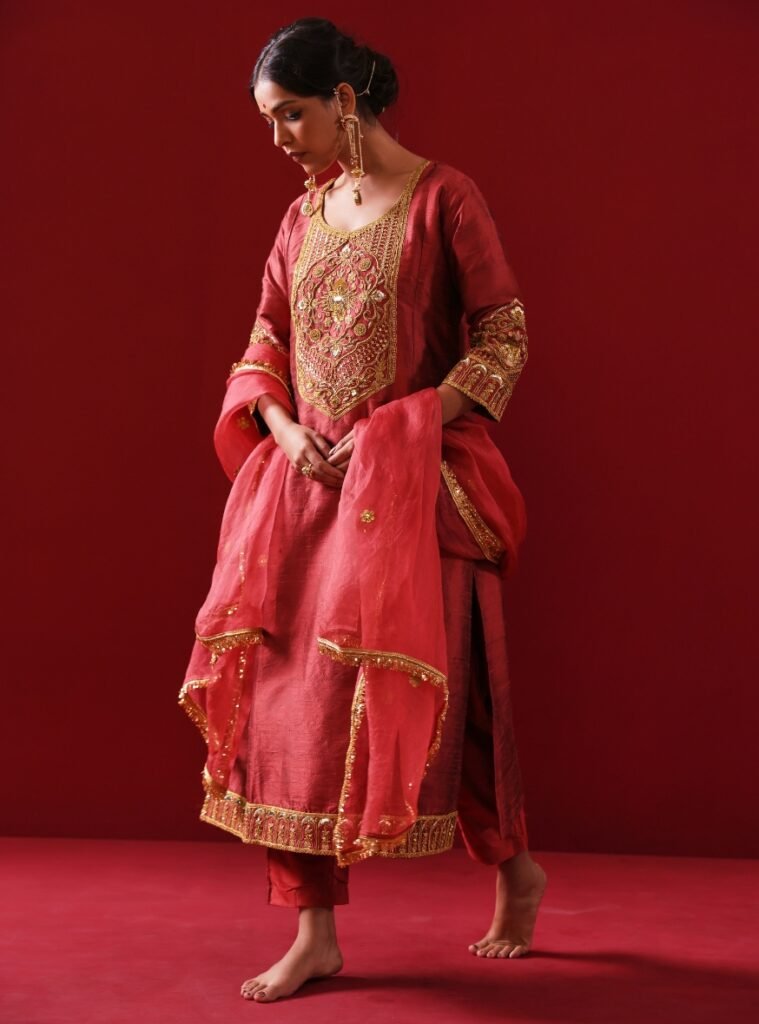 Paired with matching raw silk pants for a graceful silhouette, the ensemble is completed with a lightweight organza dupatta, adorned with delicate embellishments and ornate borders.
