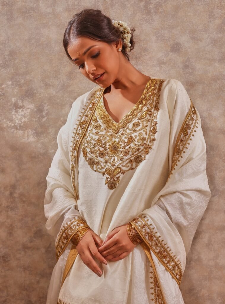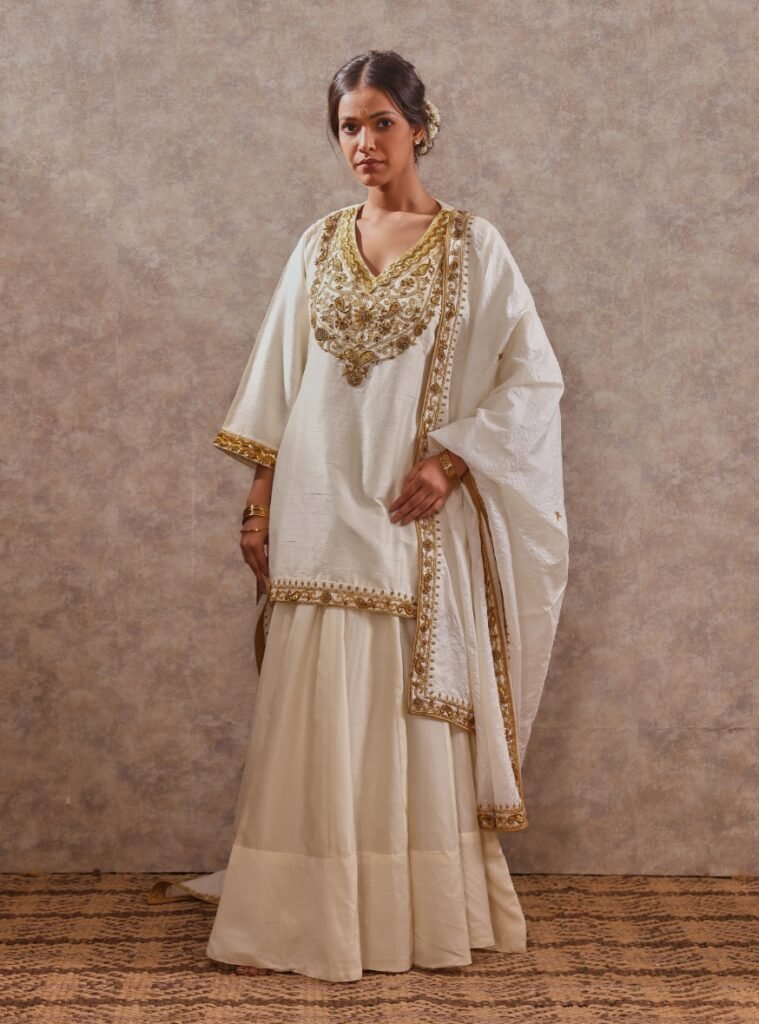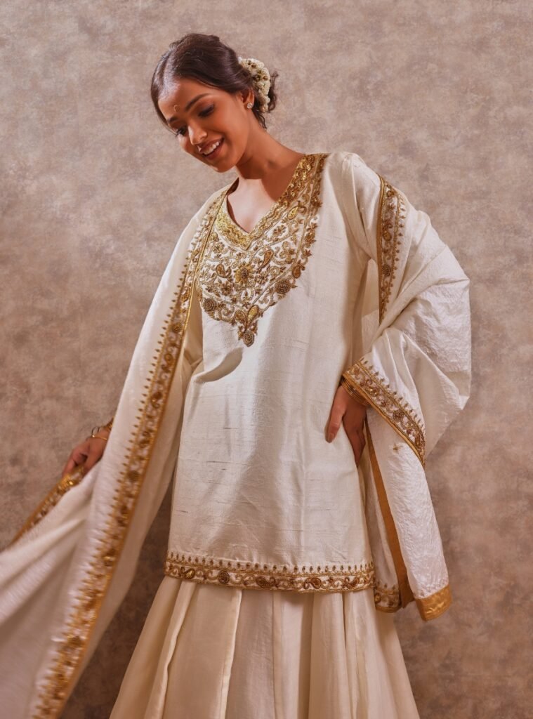 Completing the look is a soft tassar silk dupatta, detailed with delicate accents that elevate its regal charm.